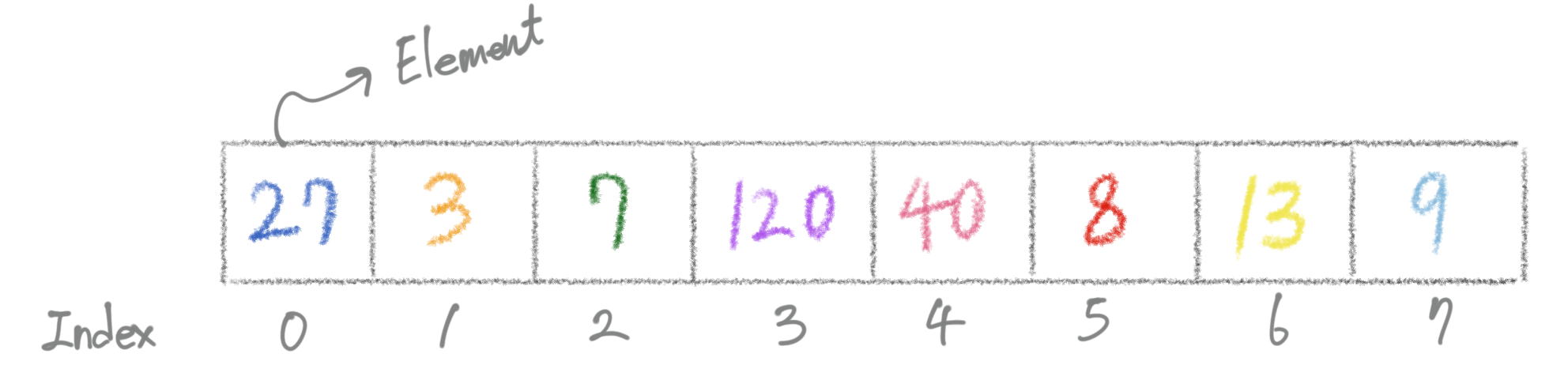 배열은 요소(Element)를 가지며, 위 그림을 보면 요소들이 연속적으로 나란히 모여있는 모습을 볼 수 있다.