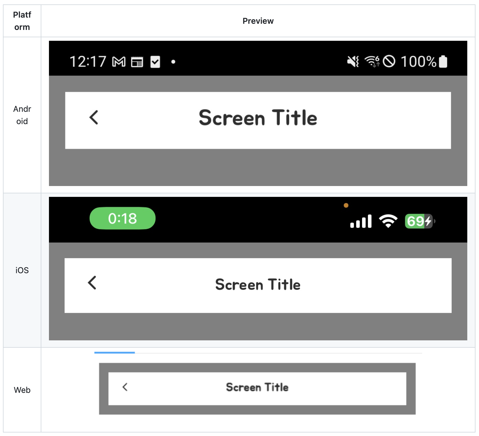 아래 사진은 AppBar 컴포넌트 예시인데, 하나의 코드로 모든 플랫폼 모두 동일한 모습의 UI 를 구현한 결과물이다.