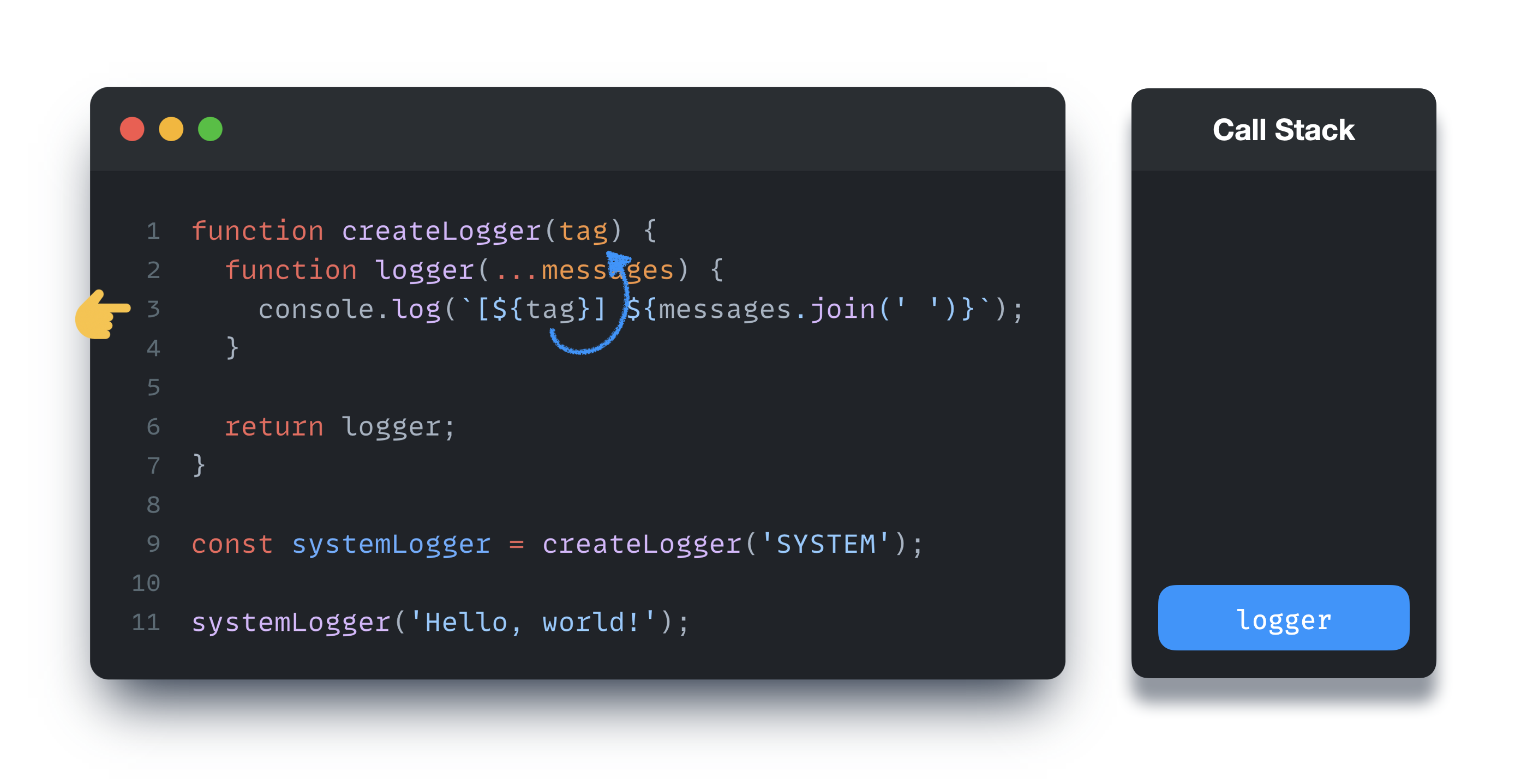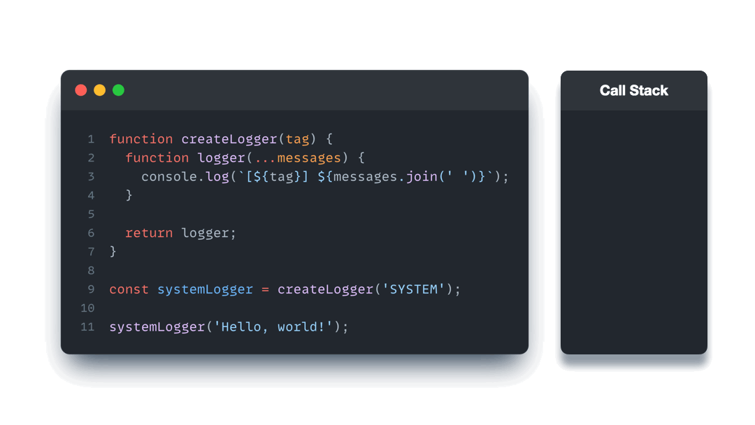logger함수 내에서createLogger함수의 매개변수tag를 참조하는 부분logger함수가createLogger함수 내부에 선언되어 있지만, 선언된 범위 밖에서 호출하는 부분