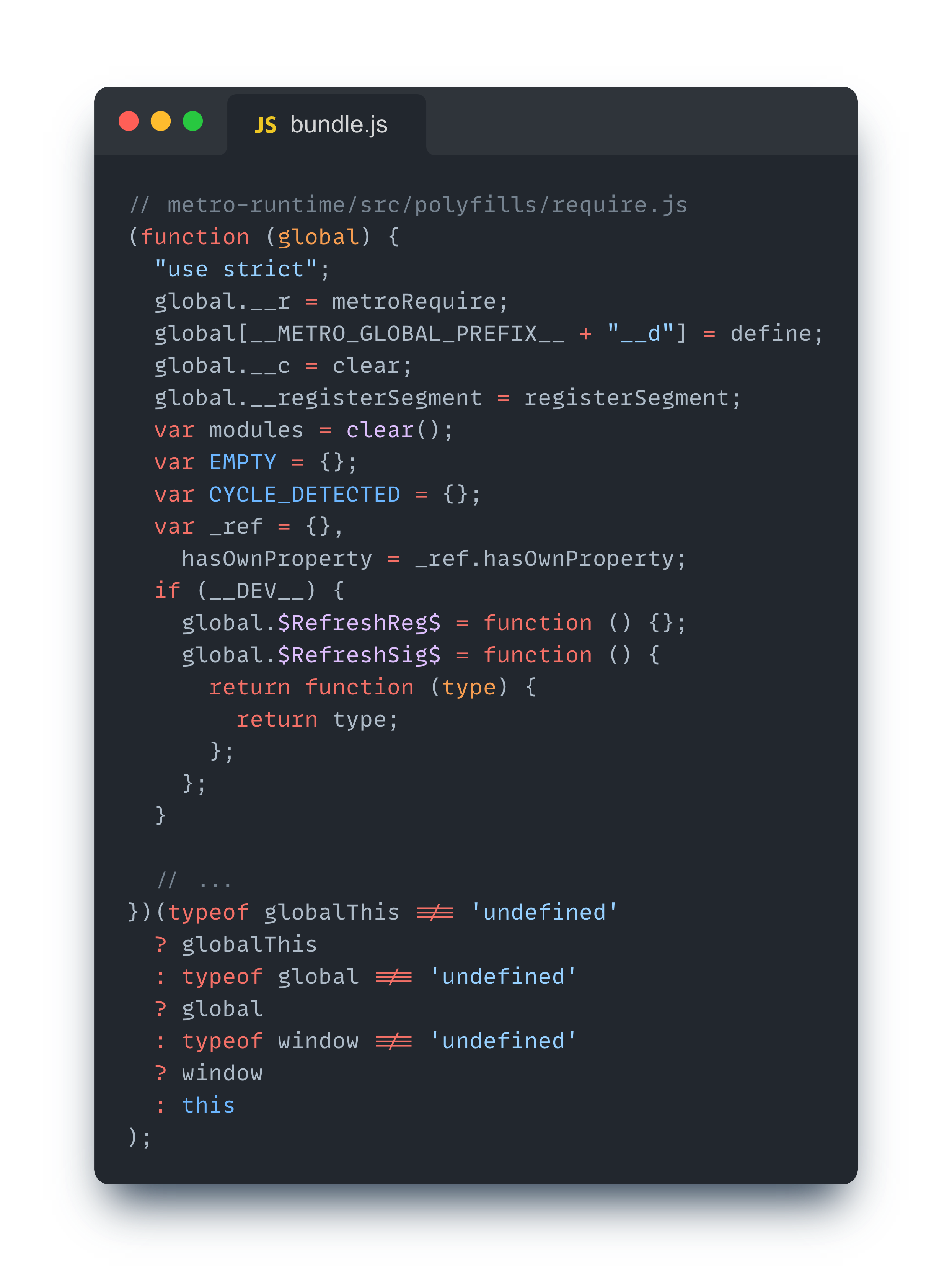 이처럼 전역 변수 그리고 폴리필들은 코드의 최상단에 위치하고 있으며, 번들 실행 시 가장 먼저 평가된다.