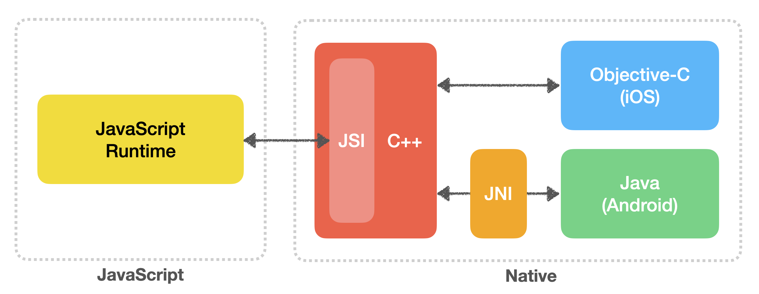 자바스크립트와 네이티브 간의 상호작용은 브릿지(Bridge)를 통해서 이루어진다는 것은 아주 오래전부터 이어져왔다. 하지만 브릿지에는 몇 가지 고질적인 성능 이슈가 있었는데 상호작용을 위해선 JSON으로 직렬화/역직렬화가 필요하고 모든 작업은 비동기적으로 처리된다는 점이다.