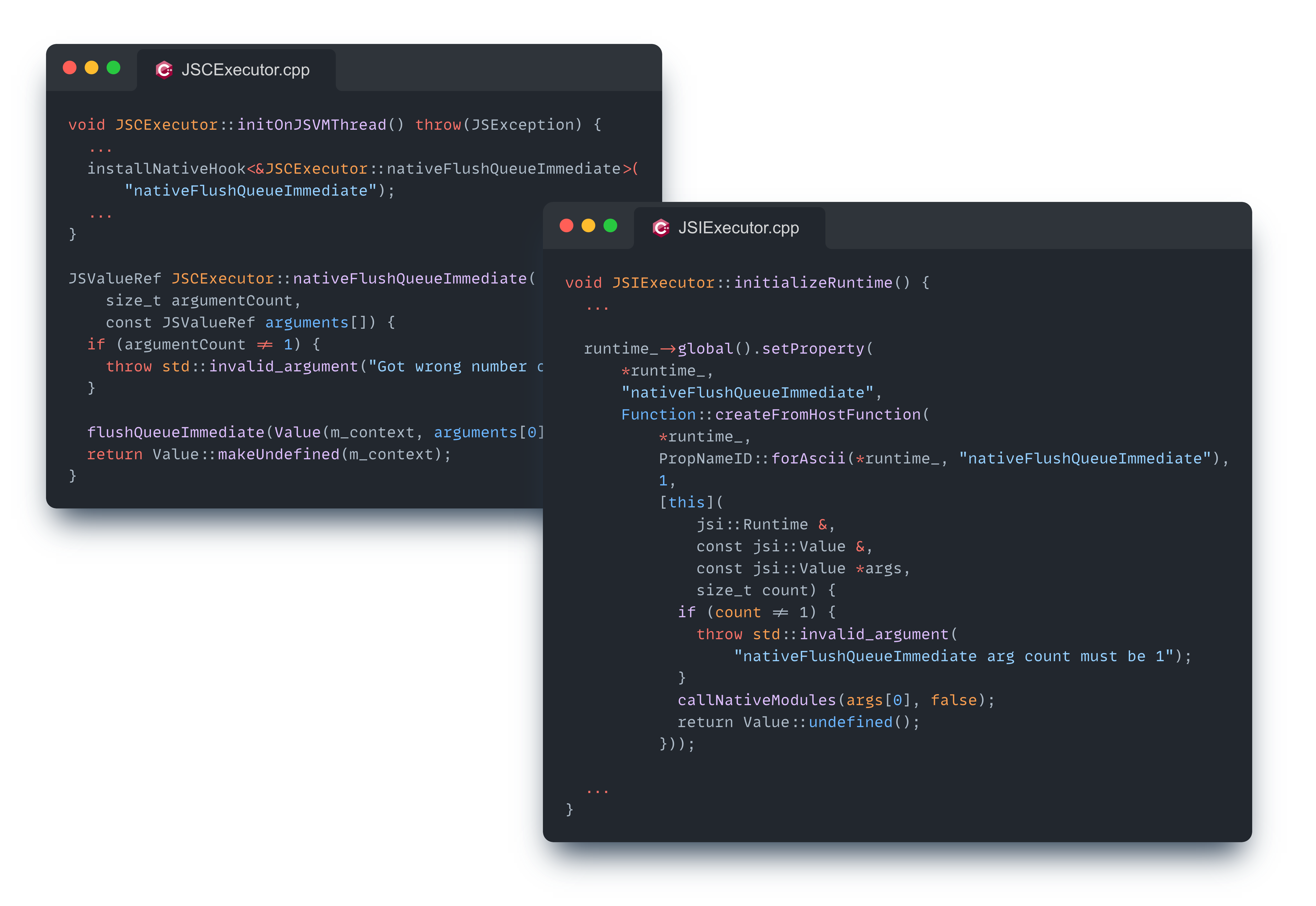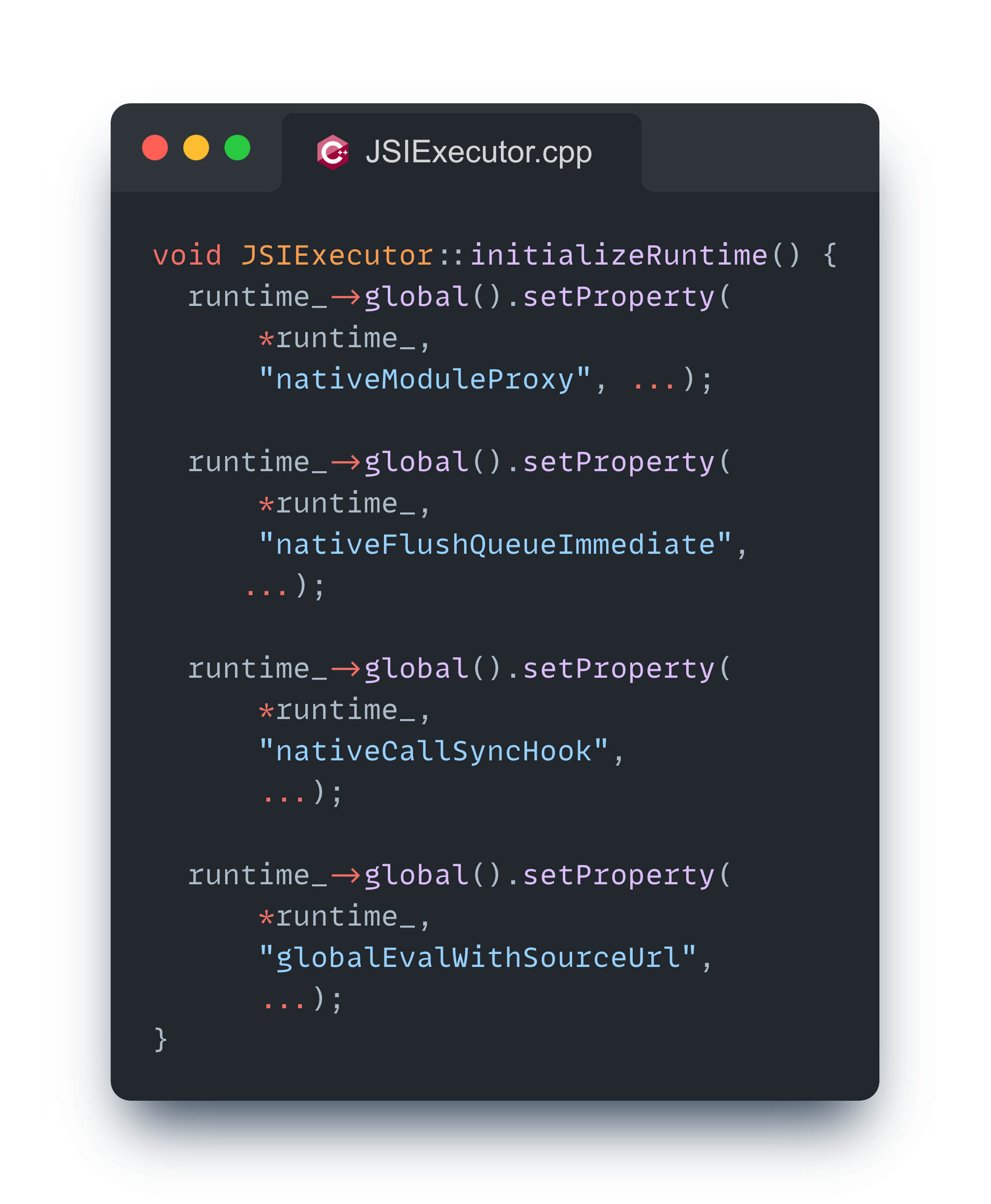 앞서 소개한 다이어그램에서도 찾아볼 수 있는데, JSIExecutor 는 JSExecutor 를 상속하고 있다. 이는 자바스크립트와 네이티브 간의 상호작용을 위한 기능들이 구현되어 있으며, 런타임 초기화 시 몇 가지 기능들을 자바스크립트 전역 컨텍스트에 노출시킨다.