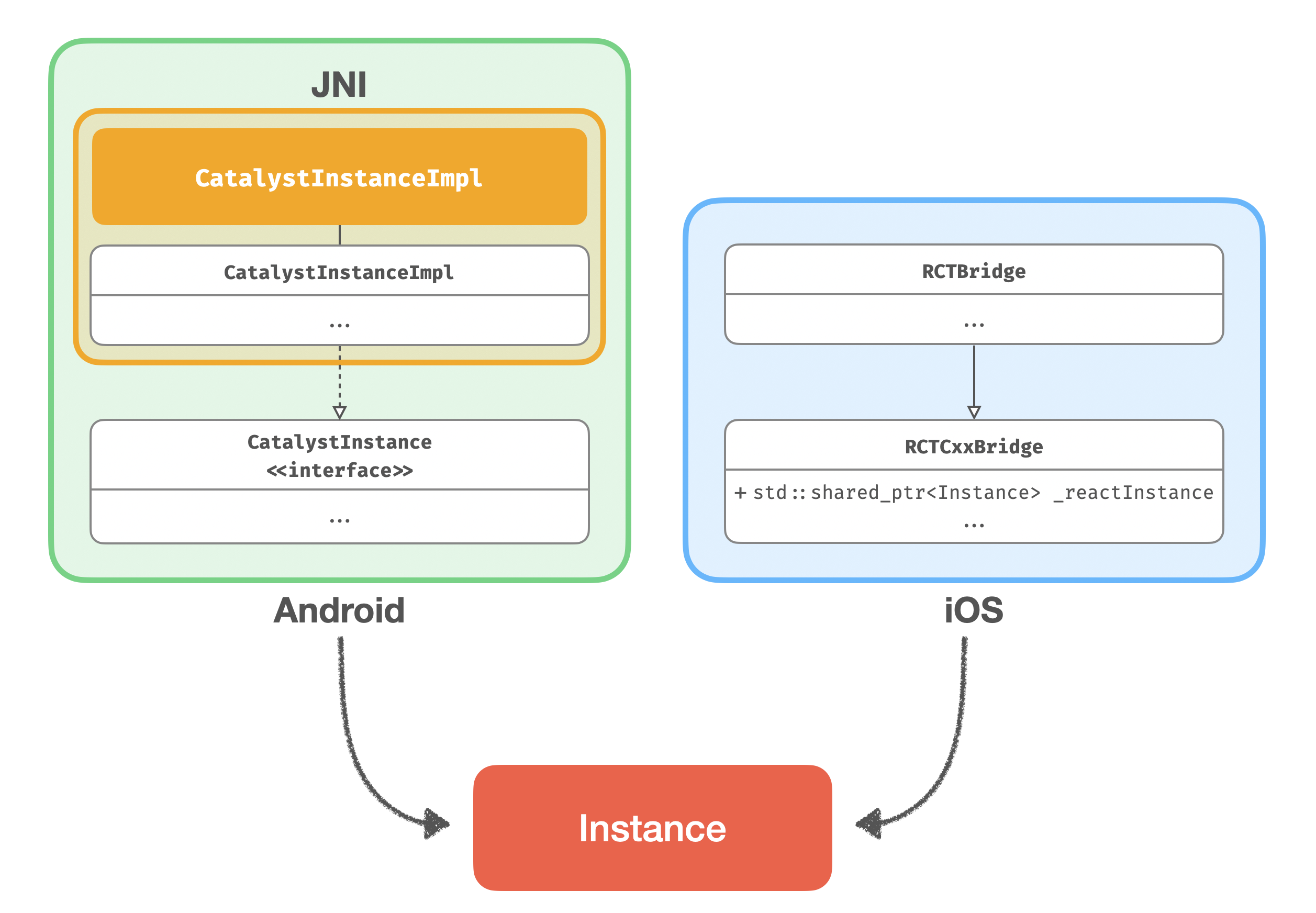 참고로 C++로 구현되어 있는 Instance 는 플랫폼에 맞게 사용되고 있는데, Android, iOS에서는 각각 CatalystInstance 그리고 RCTCxxBridge 에서 인스턴스를 생성하고 있다.