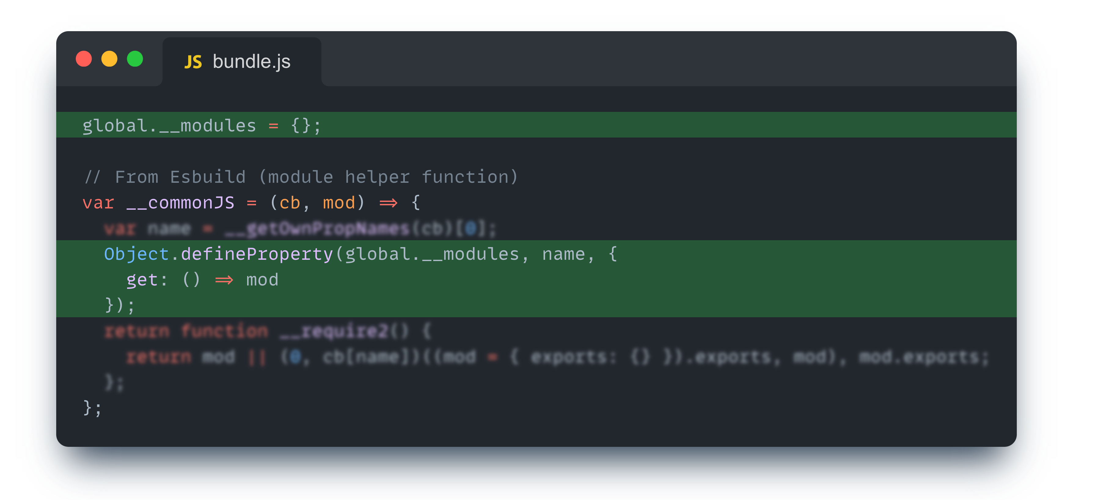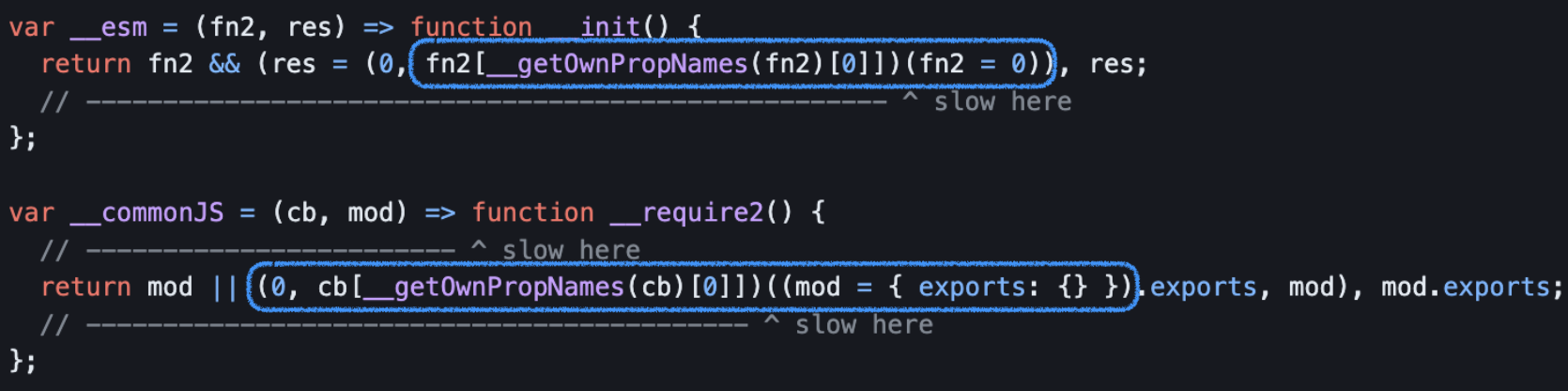 드디어 성능 이슈의 원인과 해결 방법 모두 발견했다. esbuild 번들에서 IIFE를 어떻게 없애는지가 관건인데, esbuild 번들 형식을 IIFE에서 CJS 혹은 ESM으로 구성하면 IIFE 없이 전역에 모든 모듈을 노출시키는 형태로 번들을 생성할 수 있다.