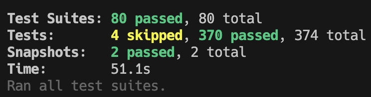 React Native는 기본적으로 babel-jest를 사용하도록 구성되어있는데, 이를 자체 구현한 변환 기능으로 대체할 수 있다. 이를 실제 프로덕션 프로젝트에 적용해 보았는데 빌드 시간과 동일하게 월등히 빠른 속도를 보여주고 있다.
