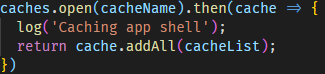 인자로는 캐싱할 리소스 URL이 있는 리스트를 받는데 우리의 cacheList를 전달해줍시다.