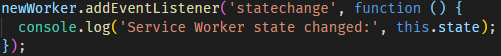 newWorker라는 변수에 설치중인 서비스워커를 담아두고 newWorker의 상태 변경을 감지합니다.